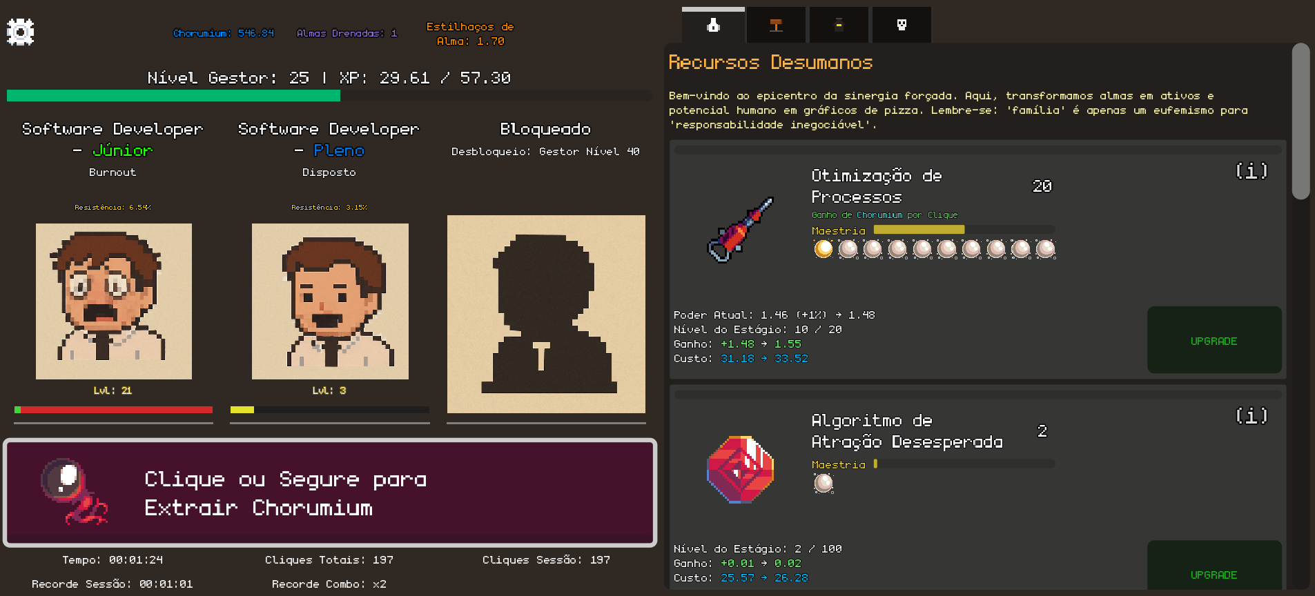In this satirical incremental idle game, your main task is to extract Chorumium, the purest essence of corporate suffering, from your dedicated "employees." Every click is a new demand, every upgrade a delightfully questionable market practice.